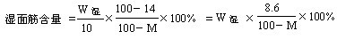 1、濕麵筋含量是以每百克含水量為14%的小麥粉含有濕麵筋的克數來表示的,如每百克試樣含水份克數為M(g),試樣質量為10g,而濕麵筋(包括篩上麵筋和篩下麵筋)稱得質量為W濕(g),則濕麵筋含量可按下列公式計算: