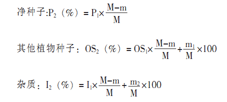 淨度檢測分析後的結果計算使用公式較多,主要為送驗樣品有重型混雜物時,最後淨度檢測分析結果應按如下公式計算: