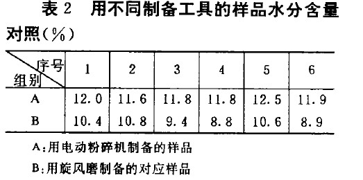 其次采用不同工具製備試樣還會得到不同的測定結果。做了這樣的對比試驗,用實驗室電動粉碎機製備一組試樣,用旋風磨製zhi得de相xiang應ying一yi組zu試shi樣yang。旋xuan風feng磨mo製zhi得de的de樣yang品pin顆ke粒li小xiao,在zai標biao準zhun規gui定ding的de時shi間jian內nei水shui分fen蒸zheng發fa得de更geng徹che底di,似si乎hu測ce得de的de結jie果guo比bi實shi驗yan室shi用yong電dian動dong粉fen碎sui機ji製zhi得de的de樣yang品pin的de結jie果guo要yao高gao些xie,更geng接jie近jin真zhen值zhi,但dan實shi際ji不bu是shi這zhe樣yang,比bi較jiao測ce定ding結jie果guo(見表2):