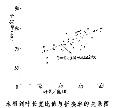 測定,證明是極顯著的,即折換值與葉長寬比的回歸關係可以成立(見圖)。