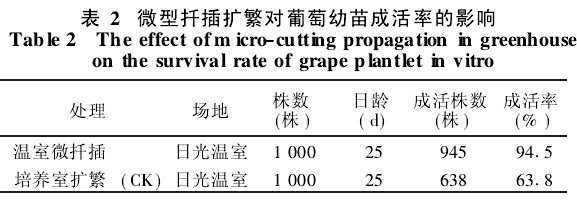 3.2 抗病性 在傳統的組培繁殖過程中,當試管苗外移馴化時但利用組培培養室進行微型扡插培養的赤霞珠小苗,基本解決了爛苗、死苗問題,提高了外移成活率(表2),從而極大地降低了生產成本。