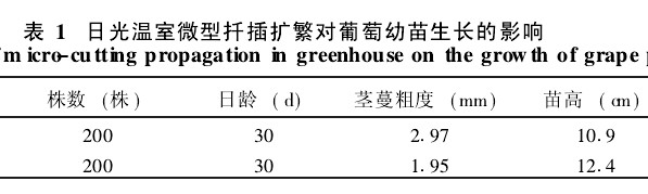 2.3 試管苗的瓶內馴化將達到要求高度的葡萄試管苗(一般每株小苗達5~7節,繁殖係數可達到6左右)移入組培培養室,擺放於畦內進行馴化。溫室溫度控製在15~30e,濕度控製在50% ~70%.在規定溫度範圍內,逐漸增強溫室內的光照強度,使瓶內試管苗逐漸適應組培培養室內的溫度和濕度環境條件。當光照強、溫度高時,進行遮光管理,以防止燒苗。一般馴化3~5 d即可,期間逐漸打開封口膜。當打開封口膜後,試管苗無萎蔫現象時,即可進行扡插繁殖。