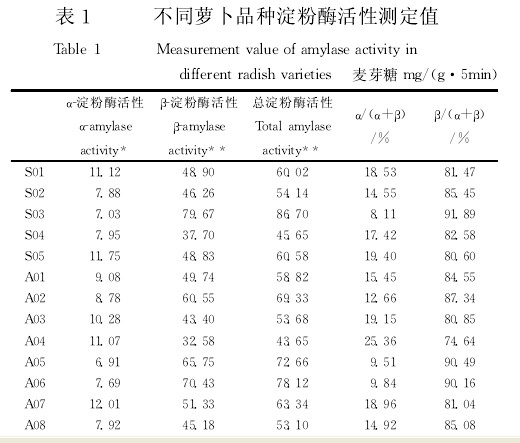 利用降落數值儀測定蘿卜肉質根的澱粉酶總活性、α?澱粉酶活性及β?澱粉酶活性。活力計量單位:麥芽糖(mg)/(g・5min)樣品鮮重。
