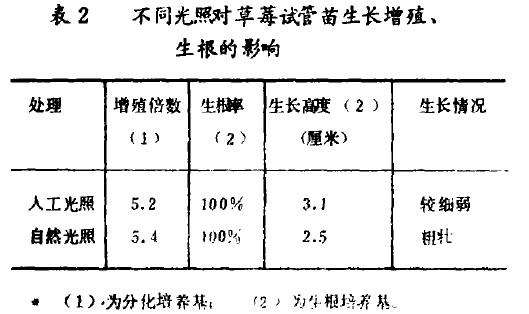 在自然光培養室內,試管植物一般都比人工光照試管苗生長得更好,從已培養的20多種植物來看,生長、分化郭很好,以草驀為例(表2),草墓繼代培養陳接種一個月以後,在分化培養基中,芽的分化很快,以叢生苗的數量計算,人工光照增殖5.2倍,自然光照增殖5.4倍,兩者基本榴以;在生根培養基中都能100%的生根;生長高度雖自然擬澳苗較矮,但粗壯,葉片濃綠,這樣的試管苗移栽易成活。