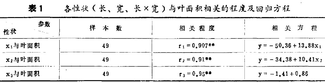 試驗於1985年在新疆八一農學院試驗田中進行,供試品種為外銷主栽品種炮台紅。在哈密瓜生長中期,隨機地在大田中選49片完整、有代表性的葉子編號,然後按順序用透明塑料薄膜描出其麵積的大小,而後以此用輪式求積儀求其而積,以及長寬的值,分別以此數據為基礎。即長、寬同實際葉而積進行相關係數法及線性回歸的擬配,通過電子計算機來求出其擬配方程岌相關條數。