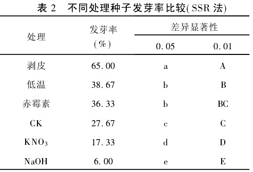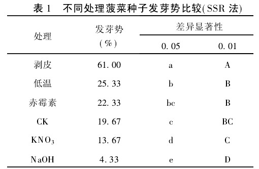 觀察種子前7d發芽情況,統計其發芽勢,對發芽勢經反正弦轉換後作方差分析,結果見表1。從表1可以看出:采用剝皮、低溫和赤黴素溶液浸種處理的種子其發芽勢高於對照,其中以剝皮處理的種子發芽勢最高。分析表明:剝皮能極顯著提高菠菜種子的發芽勢,低溫處理能顯著提高菠菜種子的發芽勢;采用KNO3和NaOH溶液進行浸種處理能顯著或極顯著擬製種子的發芽勢;采用赤黴素溶液處理的種子與對照差異不顯著。