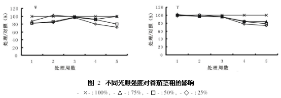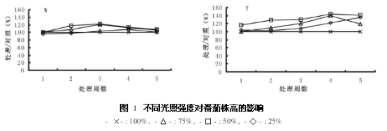 經過光照培養箱的研究並結合圖1可以得知,弱光照強度處理內的番茄株高增長大於對照,其中50%自然光照處理的株高上升幅度最大,75%自然光強處理其次,25%光強處理的番茄株高增長幅度最小。耐弱光品係W的株高增加幅度低於不耐弱光品係Y,特別是品係W在弱光處理3周後,株高增加幅度更小,而品係Y在弱光處理後株高增加幅度持續升高。