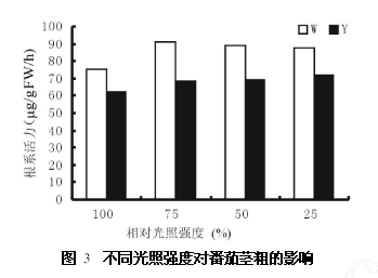 經過光照培養箱的研究,結合圖3可看出,弱光照強度下,番茄的根係活力均有不同程度的升高,其中耐弱光品係W的根係活力在弱光下升高幅度大於不耐弱光品係Y,且品係W的根係活力在所有弱光照強度下均高於品係Y。