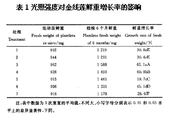 經過植物生長人工氣候室的研究並結合表1我們可以看出,在這7個處理中,由降低光照到中等關照再到高光照的過程中,金線蓮植株的鮮重增長率由低升高再到降低,處理3的鮮重增長率最高為65.1%,而處理4、5的較高,處理7的最低為28.6%,低光照的處理1、2鮮重增長率差異不顯著,與其他處理之間鮮重增長率差異極顯著。由此可見,從生長量角度來考慮,比較適合金線蓮植株生長的是處理3、4、5,即光照強度區間為2000~7000lx。