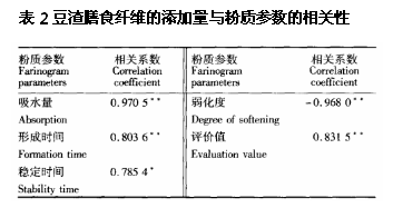 經過電子粉質儀的研究分析,並結合表2,我們可以得知,對於豆渣膳食纖維,麵團的吸水率與其添加量呈極顯著正相關關係,相關係數為0.9705,在添加量為1%~5%時,其變化值不大,當添加量為6%~8%時,有明顯的增長,麵團的形成時間與其添加量呈顯著正相關,相關係數為0.8036,麵團的穩定時間均比添加豆渣膳食纖維的麵團明顯增大,且在添加量為8%時達到最大值,麵團的弱化度與其添加量呈極顯著負相關,相關係數為-0.9680,在添加量為7%shi,dadaozuixiaozhi,zonghepingjiazhizesuizhetianjialiangdezengjiaerchengxianhuanmanshangshengqushi。zongtieryan,shanshixianweidejiaruyinqimiantuanxishuilvzengda,xingchengshijianyanchang,wendingshijianxianzhuyanchang,ruohuadujianxiao,zonghepingjiazhizengda,dianzifenzhiyijiancemiantuandefenzhitexingyedeyigaishan。zongshangsuoshu,douzhashanshixianweidejiarushimianfenfenzhiyousuogaishan,zhezhonggaishansuizhetianjialiangdezengdaerzengda。