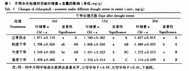 通過葉綠素測定儀的研究並分析表明,幹旱脅迫10天、15天時輕度幹旱與對照差異較小,不顯著,幹旱脅迫20天時差異達顯著水平,表明幹旱的持續時間對葉綠素a的含量影響較大,即使是輕度幹旱脅迫,持續時間過長也顯著降低苧麻葉綠素a含量。各時間段中度幹旱處理和中度幹旱處理與對照之間的差異均達顯著或極顯著水平,表明幹旱脅迫的程度對葉綠素a含量具有重要的影響,嚴重幹旱脅迫在較短的時間內也顯著降低葉綠素a含量。