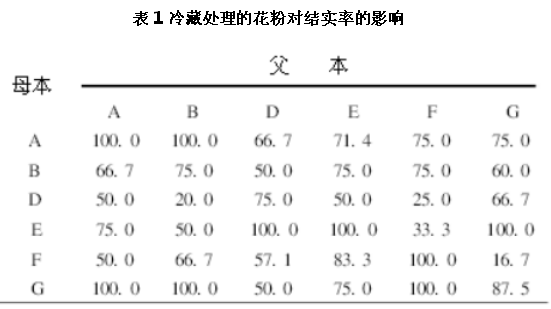 通過種子低溫低濕儲藏櫃的研究並結合表1我們可以看出,種間雜交所用花粉為冷藏的花粉,自交及種內雜交所用花粉為新鮮花粉對結實率的影響兩者間沒有表現出明顯的規律。2個有棱絲瓜品種間及4個普通絲瓜品種間結實率均為表現出明顯的規律。普通絲瓜中廣州水瓜(D)為母本的結實率均較低,可能與廣州水瓜植株長勢弱、不易坐果有關。從表2結果還可以看出,有些特定組合如D×B、D×F、E×和F×G的結實率偏低,可能與這些雜交組合中雙親的遺傳親和性偏低有關。試驗結果表明有棱絲瓜和普通絲瓜正反交F₁間沒有生殖隔離現象。