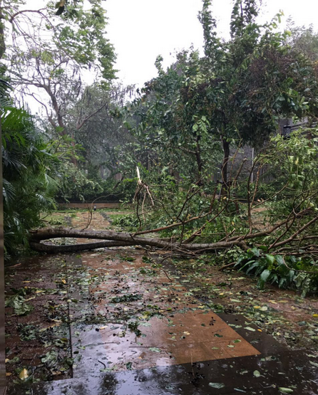 10月18日上午,海口某酒店內樹枝錯雜,一地狼藉。