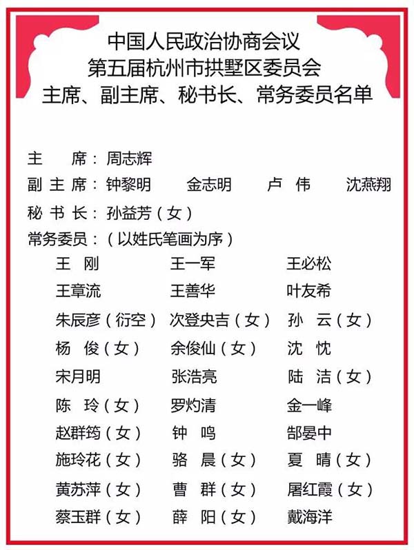 (2017年1月9日政協第四屆杭州市拱墅區委員會常務委員會第29次會議通過)(以姓氏筆畫為序)
