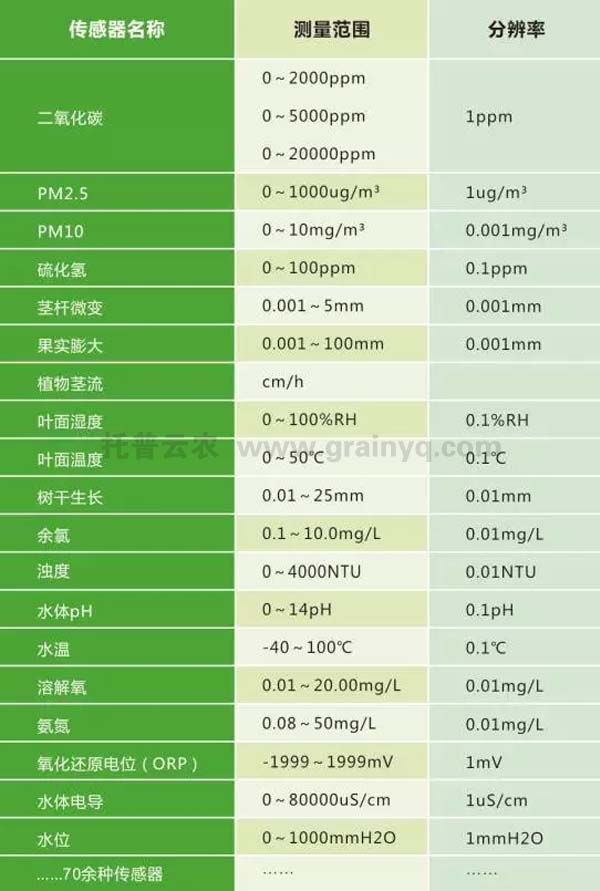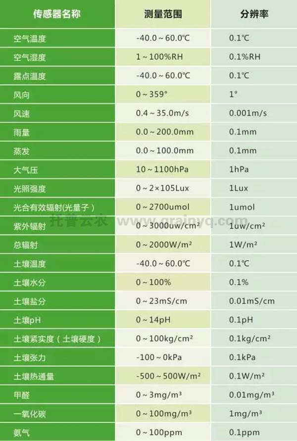 在農業氣象方麵,目前有空氣溫度、濕度、光照強度、光合有效輻射、二氧化碳、雨量、蒸發、風速風向、大氣壓、總輻射、紫外輻射等傳感器。同時,還有應用於畜禽養殖監測的氨氣、硫化氫等傳感器,應用於水質監測的pH、餘氯、濁度、溶解氧、氨氮、水溫等傳感器,應用於環境監測的一氧化碳、二氧化碳、甲醛、PM2.5、PM10等傳感器。
