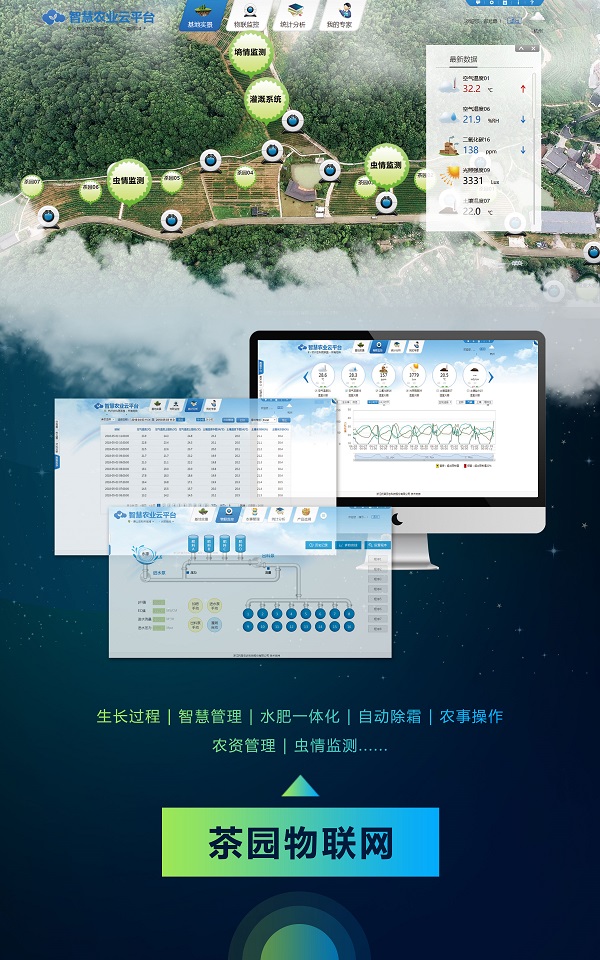 茶園物聯網:生長過程,智慧管理。水肥一體化、自動除霜、農事操作、農資管理、蟲情監測......