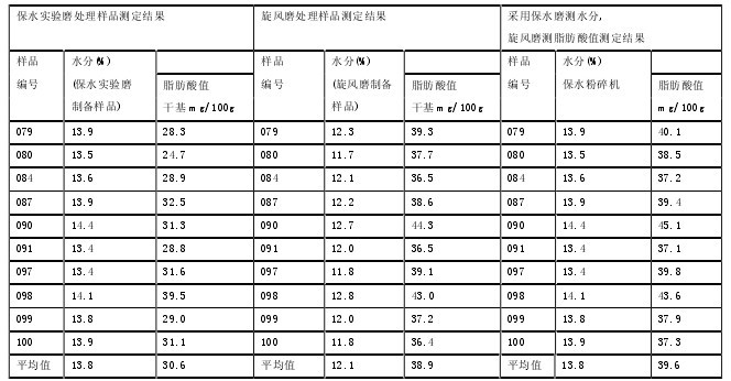 在玉米、稻穀脂肪酸值的測定過程中要使用到不同的實驗磨,因為脂肪酸值以幹基計算,測定玉米、稻穀水份使用保水實驗磨;製備樣品使用錘式旋風磨。在實際工作中,單一使用保水磨或單一使用旋風磨處理樣品對測定脂肪酸值的影響進行探討。我們抽取了不同水分的10個玉米、10個稻穀樣品做對照實驗,分別使用三種方式處理玉米、稻穀樣品測定樣品幹基脂肪酸值。