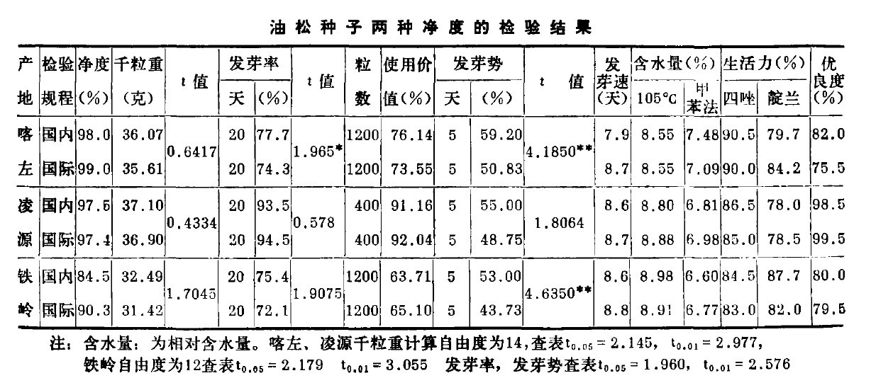 (4)對兩種淨度油鬆種子做發芽試驗,其發芽率和千粒重進行t值檢驗,種子淨度基礎上沒有顯著差異,說明按國內法隻能增加室內檢驗工作量,沒有實際意義。所謂兩法淨