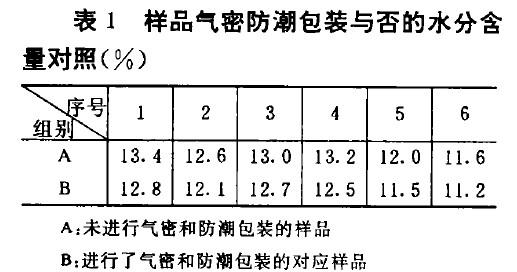 首(shou)先(xian)應(ying)十(shi)分(fen)注(zhu)意(yi)樣(yang)品(pin)的(de)包(bao)裝(zhuang),防(fang)止(zhi)樣(yang)品(pin)發(fa)生(sheng)結(jie)露(lu)。檢(jian)測(ce)糧(liang)食(shi)水(shui)分(fen)時(shi)從(cong)抽(chou)樣(yang)到(dao)稱(cheng)樣(yang)有(you)個(ge)過(guo)程(cheng),樣(yang)品(pin)未(wei)裝(zhuang)在(zai)氣(qi)密(mi)和(he)防(fang)潮(chao)容(rong)器(qi)時(shi),其(qi)所(suo)處(chu)的(de)環(huan)境(jing)溫(wen)度(du)盡(jin)可(ke)能(neng)一(yi)致(zhi),不(bu)能(neng)驟(zhou)冷(leng)驟(zhou)熱(re),否(fou)則(ze)會(hui)影(ying)響(xiang)其(qi)測(ce)定(ding)結(jie)果(guo)的(de)準(zhun)確(que)性(xing)。筆(bi)者(zhe)曾(zeng)從(cong)現(xian)場(chang)幾(ji)個(ge)總(zong)樣(yang)品(pin)各(ge)分(fen)出(chu)兩(liang)個(ge)平(ping)行(xing)樣(yang)品(pin),一(yi)個(ge)進(jin)行(xing)了(le)氣(qi)密(mi)和(he)防(fang)潮(chao)包(bao)裝(zhuang),一(yi)個(ge)未(wei)加(jia)包(bao)裝(zhuang)樣(yang)品(pin)放(fang)在(zai)冷(leng)氣(qi)車(che)內(nei),最(zui)後(hou)測(ce)得(de)每(mei)對(dui)平(ping)行(xing)樣(yang)品(pin)的(de)水(shui)分(fen)結(jie)果(guo)如(ru)下(xia)(見表1):