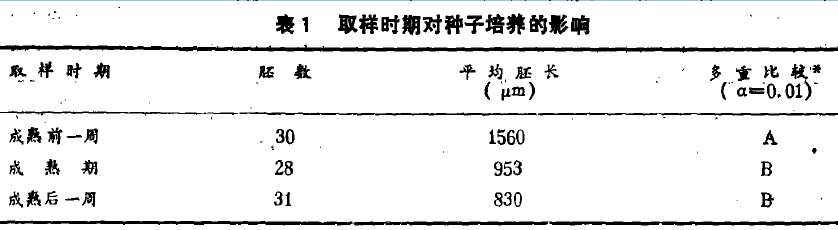 用0.1%升汞水溶液將果實表麵消毒10分鍾,無菌水衝洗3~5次,於無菌條件下肺剖出種子,在培養基上培養。所用基本培養基為MS+5%蔗糖十0.6%瓊脂十LH100ppm.