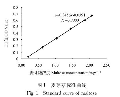 1.2.4麥芽糖標準曲線的製作精確稱取100mg麥芽糖,用蒸餾水溶解並定容至100mL即為標準麥芽糖溶液(1mg/mL):用移液器分別吸取0、0.2、0.6、1.0、1.4、1.8和2.0mL的麥芽糖標準液分別放置幹淨的具塞刻度試管中,加蒸餾水至2.0mL,混勻後分別加入2mL3,5-二硝基水楊酸試劑,搖勻,置沸水浴中煮沸5min.取出後流水冷卻,加蒸餾水定容至20mL.以1號管作為空白調零點,在540nm波長下比色測定。