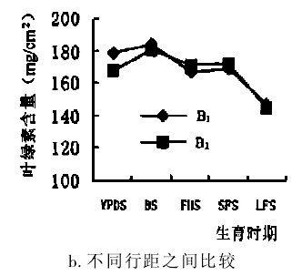 進一步對各生育時期葉片葉綠素含量進行方差分析的結果表明(表1),各個生育時期影響葉片葉綠素含量的主要因素不同。在幼穗分化期,主要受插秧量的影響,不同插秧量之間葉綠素含量差異極顯著,即插單苗的葉綠素含量極顯著地高於插三苗的。而行距和品種對葉綠素含量的影響反而不明顯。到齊穗期,不同插秧量對葉綠素含量的影響依然存在,但葉綠素含量已經開始主要受品種決定,開始表現出品種本身的特性:遼優3225的葉綠素含量高於遼粳326,又極顯著高於屜優418。而到了灌漿盛期,葉綠素含量幾乎完全由品種決定,品種本身的特性充分體現出來,此時3個品種的葉綠素含量差異更大,遼優3225極顯著高於遼粳326,而遼粳326又極顯著高於屜優418。灌漿後期由於葉片逐漸衰老,各種因素的作用已經不是很明顯。這說明水稻葉片葉綠素含量前期主要受栽培環境條件製約,而後期主要由品種自身特性所決定。