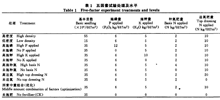 呼市供試品種為蒙麥28號,巴盟為永良4號。試驗分別選取基本苗數、施磷量、施鉀量、種氮肥量、追氮肥量五項農藝措施作五因素三水平隨機區組設計,以未施肥區為對照,共12個處理,重複兩次。試驗處理及水平見表to磷、鉀及種氮肥在播種時一次性深施,追氮肥在分縈期一次性追施。