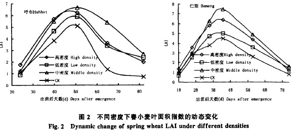 兩地區試驗結果表明,不同密度處理下春小麥的葉麵積指數的變化(圖2),在拔節以前表現為:高密>中密>低密>對照,峰值期在孕穗期,而峰值的高低為中密>高密>低密>duizhao。yunsuizhihou,youyugaomiduchulizhujianjingzhengjilie,tongfengtouguangbuliang,yemianjizhishuxunsuxiajiang。erzhongmiduchulixiajiangpinghuan,daowanshuqi,gaomichulihedimichulijiaodi,zhongmichulirengweichijiaogaoshuiping,erduizhaozuidi。