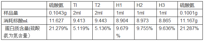 醬油樣品在濃硫酸和催化劑硫酸銅、硫酸鉀高溫下,把有機的細胞結構破壞,把氮元素和硫酸反應產生硫酸銨,(為了使得樣品消化時不產生掛壁,必須采用樣品孔間溫差小和帶程序升溫功能的消化爐,否則會產生掛壁現象,導致消化失敗)消化完成後,需要將樣品冷卻到40℃左右,再把消化管放入定氮儀上。儀器對消化管內自動添加稀釋液、堿(jian),反(fan)應(ying)杯(bei)內(nei)自(zi)動(dong)添(tian)加(jia)硼(peng)酸(suan)和(he)顯(xian)色(se)劑(ji)。對(dui)消(xiao)化(hua)管(guan)內(nei)樣(yang)品(pin)加(jia)熱(re)蒸(zheng)餾(liu),逸(yi)出(chu)氨(an)氣(qi)和(he)水(shui)蒸(zheng)氣(qi)混(hun)合(he)氣(qi)體(ti),冷(leng)卻(que)成(cheng)氨(an)水(shui)流(liu)到(dao)反(fan)應(ying)杯(bei)內(nei)生(sheng)成(cheng)硼(peng)酸(suan)氨(an),同(tong)時(shi)用(yong)標(biao)準(zhun)硫(liu)酸(suan)進(jin)行(xing)滴(di)定(ding),直(zhi)到(dao)蒸(zheng)餾(liu)結(jie)束(shu)和(he)滴(di)定(ding)到(dao)終(zhong)點(dian)。儀(yi)器(qi)自(zi)動(dong)計(ji)算(suan)醬(jiang)油(you)中(zhong)蛋(dan)白(bai)質(zhi)含(han)量(liang)(蛋白質係數取5.71)。