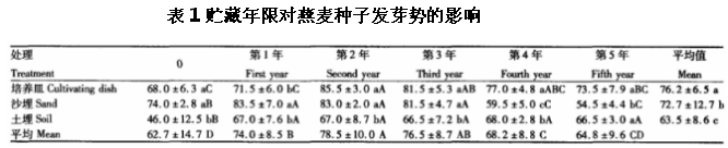 通常種子發芽勢可用衡量種子發芽力。種子發芽勢高,則表示種子活力強,發芽整齊,出苗一致,增產潛力大。貯藏年限對“青引1號”燕麥種子發芽勢的影響見表1。