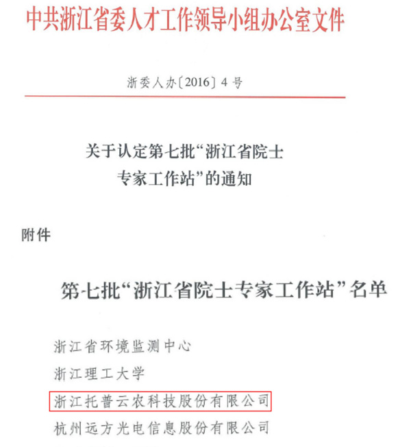 7月25日,中共浙江省委人才工作領導小組辦公室公布了第七批“浙江省院士專家工作站”名單,此次共有22家單位上榜,杭州市2家。浙江省托普雲農科技股份有限公司(以下簡稱“托普雲農”)成為浙江農業信息化領域內第一家獲此殊榮的企業。