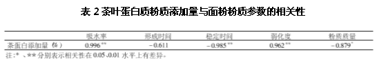 利用電子粉質儀研究,結合表2可知,將茶葉蛋白質添加至麵粉中,麵團的吸水率與蛋白質加量呈現極顯著的正相關,相關係數為0.996,麵團吸水率隨著茶葉蛋白質添加量的增加而增大,麵團形成時間與茶葉蛋白質添加量相關係數為-0.611,呈現負相關,相關性不是特別顯著。麵團穩定時間隨著茶葉蛋白質添加量的增加而降低,呈極顯著的負相關,相關係數為-0.985,隨著茶葉蛋白質添加量的增加,麵團弱化度增加,茶葉蛋白質添加量與麵團弱化度之間呈現極顯著相關性,相關係數為0.962,總體而言,粉質質量指數隨著茶葉蛋白添加量的增加呈現下降趨勢,添加量為1%時,麵團粉質質量指數有所提高。綜上電子粉質儀的研究,茶葉蛋白質添加量為1%時,對麵粉的粉質特性有所改善,隨著添加量的繼續增加,麵粉粉質特性呈弱化趨勢。