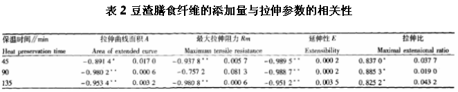 按照不同比例添加豆渣膳食纖維的麵粉的拉伸特性見表1,添加量與拉伸特性各參數的相關性見表2,通過小麥粉麵團拉伸儀的研究並結合表1,我們可以從中得知,麵團的能量、抗拉阻力、延(yan)伸(shen)度(du)均(jun)與(yu)膳(shan)食(shi)纖(xian)維(wei)的(de)添(tian)加(jia)量(liang)呈(cheng)負(fu)相(xiang)關(guan),這(zhe)可(ke)能(neng)是(shi)由(you)於(yu)豆(dou)渣(zha)膳(shan)食(shi)纖(xian)維(wei)的(de)添(tian)加(jia),使(shi)麵(mian)筋(jin)蛋(dan)白(bai)被(bei)稀(xi)釋(shi),使(shi)得(de)麥(mai)穀(gu)蛋(dan)白(bai)和(he)麥(mai)膠(jiao)蛋(dan)白(bai)妨(fang)礙(ai)了(le)麵(mian)筋(jin)網(wang)絡(luo)的(de)形(xing)成(cheng),使(shi)麵(mian)筋(jin)蛋(dan)白(bai)的(de)延(yan)展(zhan)性(xing)下(xia)降(jiang)。但(dan)是(shi)麵(mian)團(tuan)的(de)拉(la)力(li)比(bi)與(yu)添(tian)加(jia)量(liang)呈(cheng)顯(xian)著(zhu)正(zheng)相(xiang)關(guan),且(qie)在(zai)添(tian)加(jia)量(liang)為(wei)6%時,拉力比達到最大值,而抗拉阻力的添加量為2%時為最高。