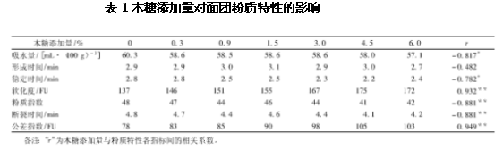 不同添加量的木糖對麵粉粉質有著不同程度的影響,木糖添加量對麵團粉質特性的影響見表1。