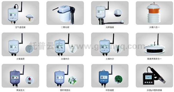 在農業氣象方麵,目前有空氣溫度、濕度、光照強度、光合有效輻射、二氧化碳、雨量、蒸發、風速風向、大氣壓、總輻射、紫外輻射等傳感器。同時,還有應用於畜禽養殖監測的氨氣、硫化氫等傳感器,應用於水質監測的pH、餘氯、濁度、溶解氧、氨氮、水溫等傳感器,應用於環境監測的一氧化碳、二氧化碳、甲醛、PM2.5、PM10等傳感器。
