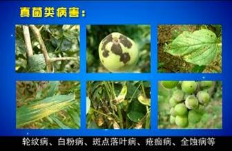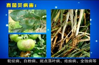 真菌類:灰黴病、霜黴病、猝倒病、枯黃病、立枯病、早晚疫病、莖枯病、蔓枯病、黑星病、黑斑病、鏽病、輪紋病、白粉病、斑點落葉病、瘡痂病、全蝕病;